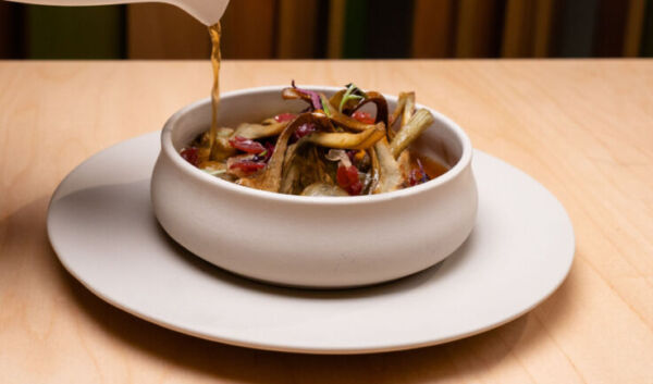 ALCACHOFAS FRITAS, sobre un puré de ajo asado, caldo y lascas de ibérico.